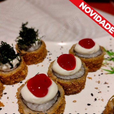 Salmão, cheese , alga, arroz empanado a panko e frito