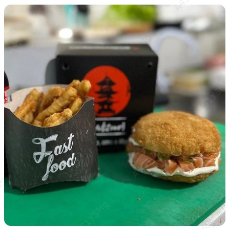 Trio com Burguer Matsuri Salmão, Lula empanada e Cocacola lata.