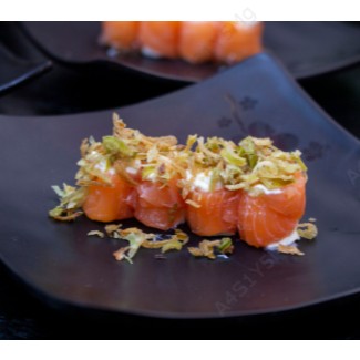 Lâmina de salmão, cream cheese, alho poró frito.