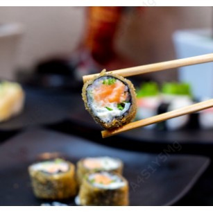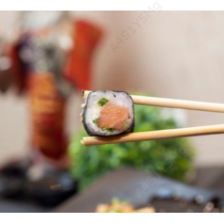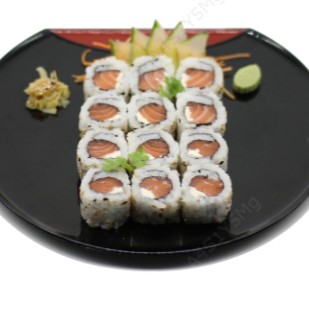 Arroz, salmão, cream cheese, cebolinha, enrolado na alga nori.