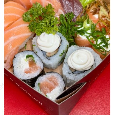 8 sashimis salmão, 8 jholl poró, 10 hot filadélfia , 5 filadelfia maki . Grátis 2 harumaki de camarão