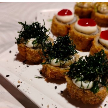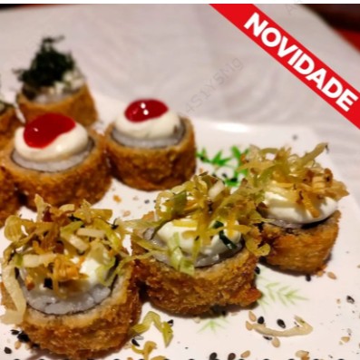 Arroz por fora, camarão empanado, alho poró, cream cheese, enrolado na alga nori.