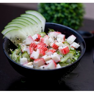 Salada de pepino fatiado ao molho sú adocicado, kani e gergelim.