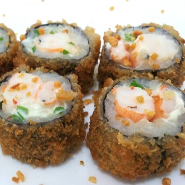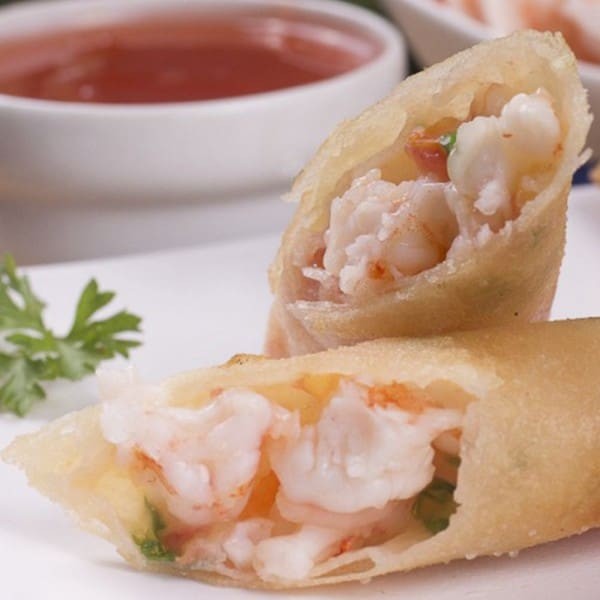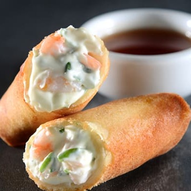 Tradicional rolinho primavera crocante recheado com camarão e catupiry.