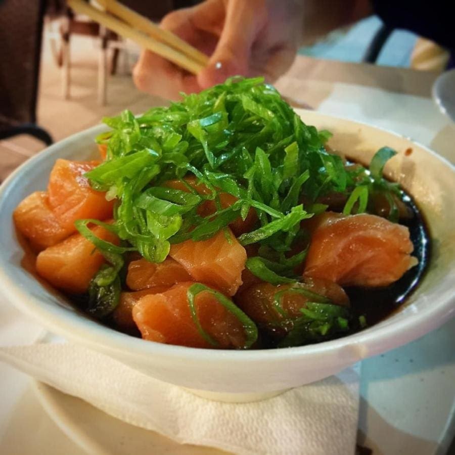 Com Arroz, salmão picadinho de salmão com raspas de limão e azeite trunfado