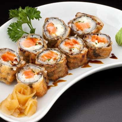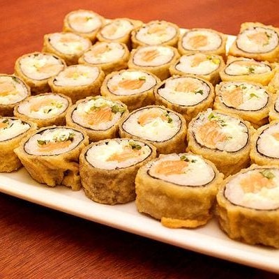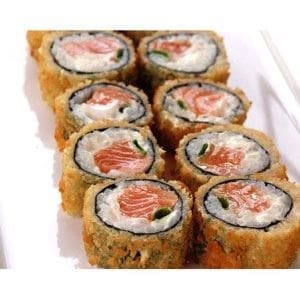 Tradicional rolinho primavera crocante recheado com salmão e catupiry.