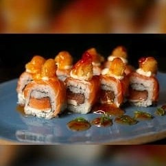 Uramaki com mais salmão pipoca de camarão e geleia de pimenta