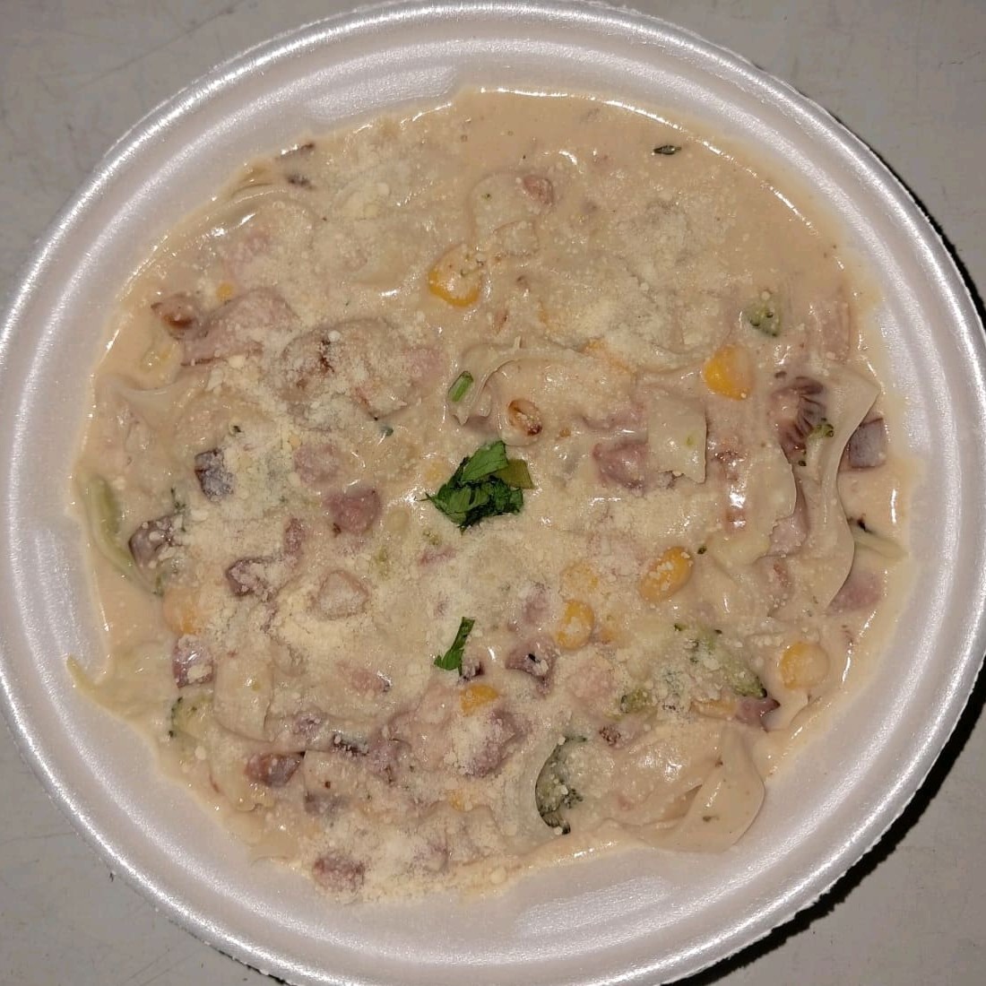 Talharim com Bacon, calabresa, milho e molho branco.