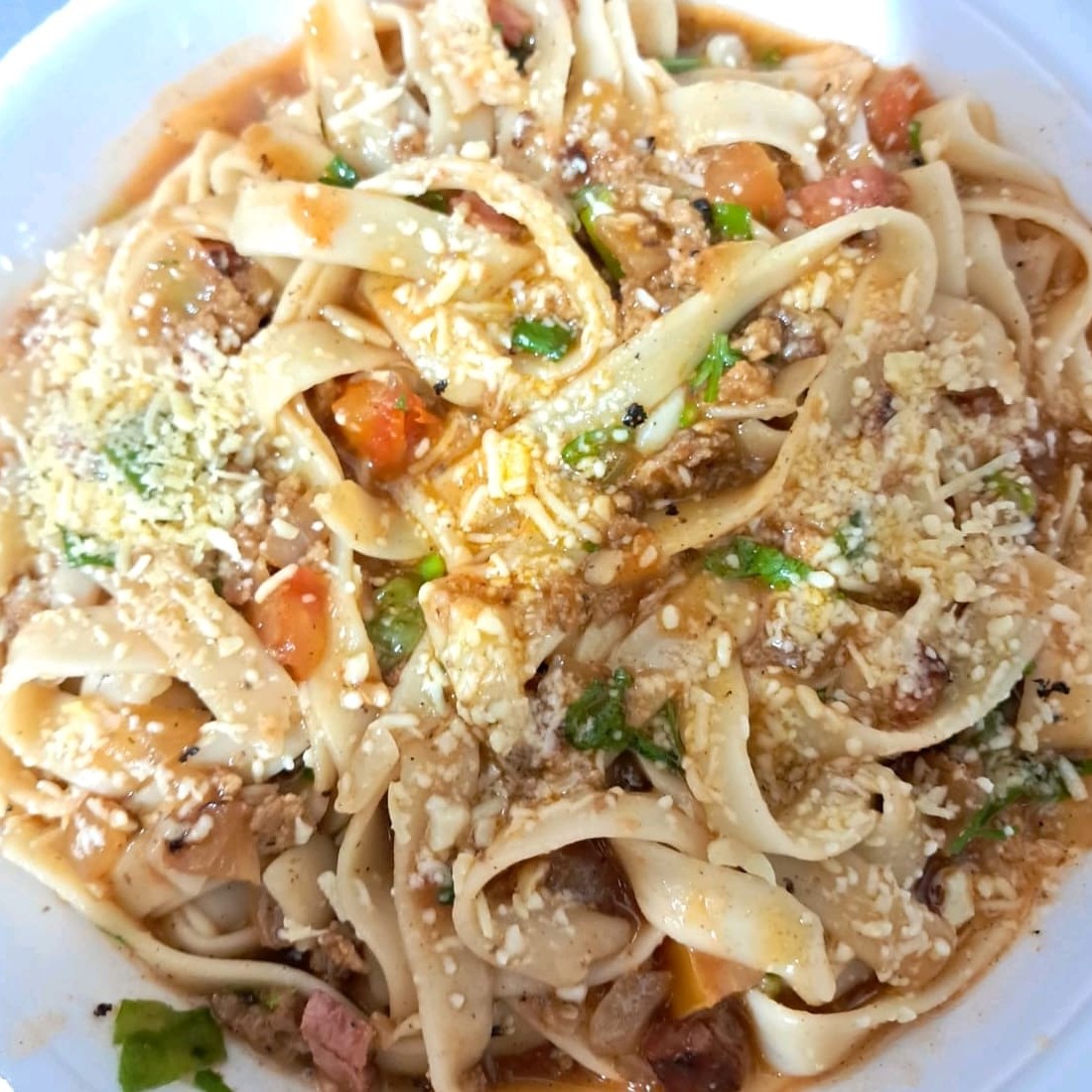 Talharim à bolonhesa, com tomate, cebola e cheiro verde