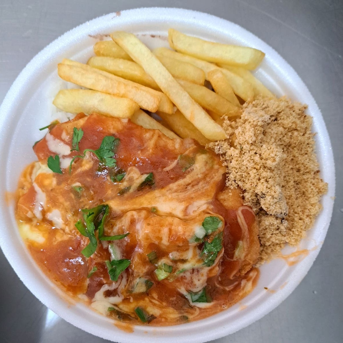 toscana em rodelas acebolada, farofa batata frita , arroz e feijão