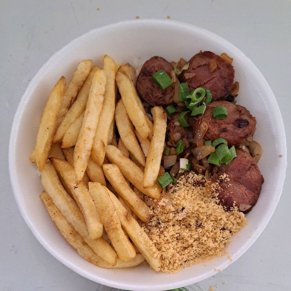 arroz, feijão, calabresa acebolada e farofa
