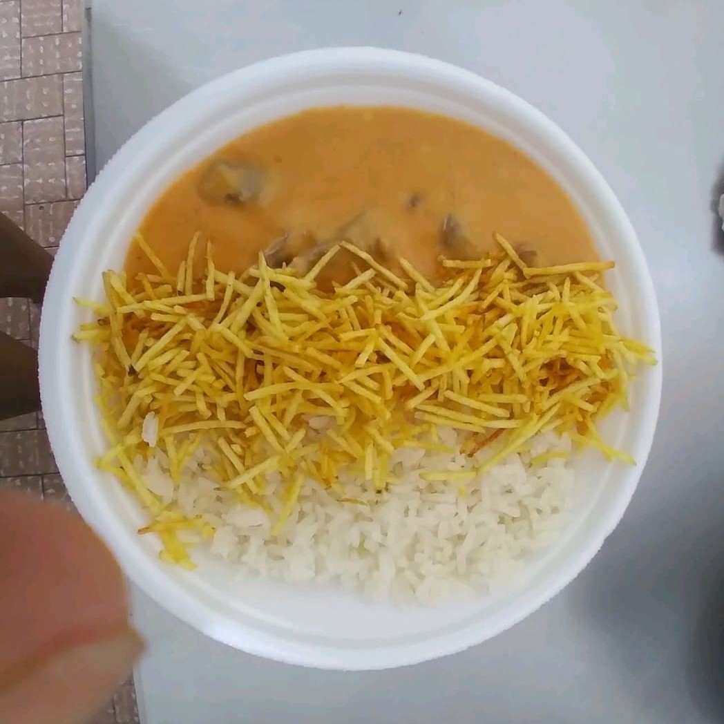 Estrogonofe de frango cremoso com champignon, servido com arroz e batata palha crocante.
