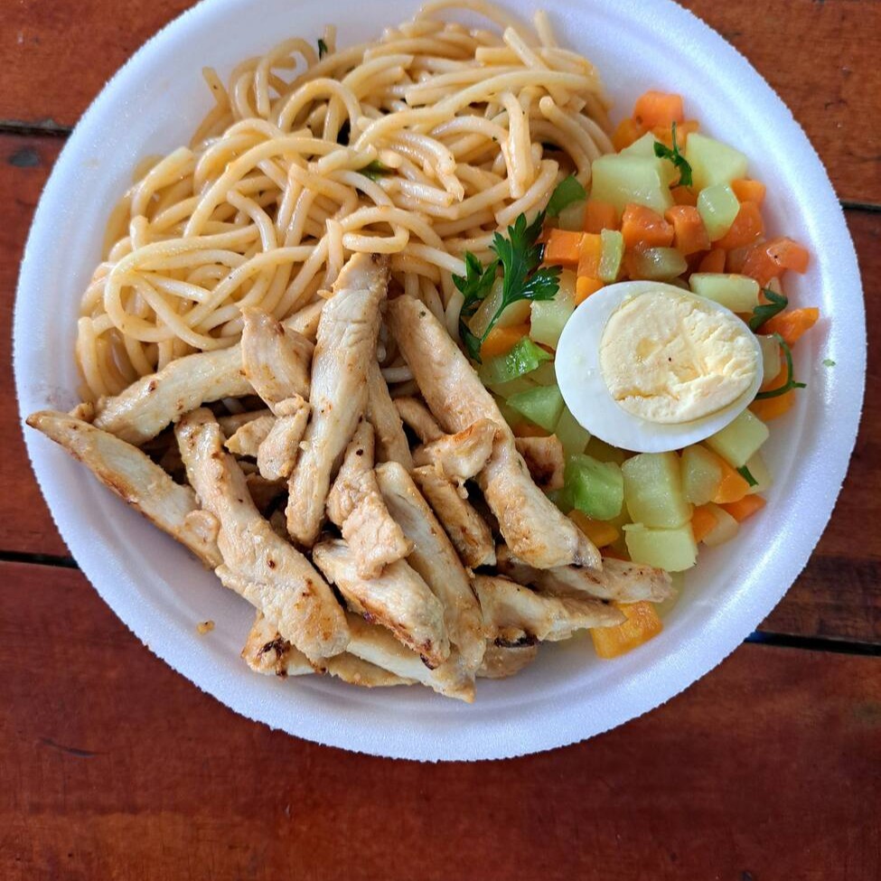 frango em cubos grelhados e acebolado, arroz, feijão, salada de alface, tomate e farofa.