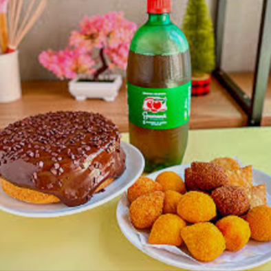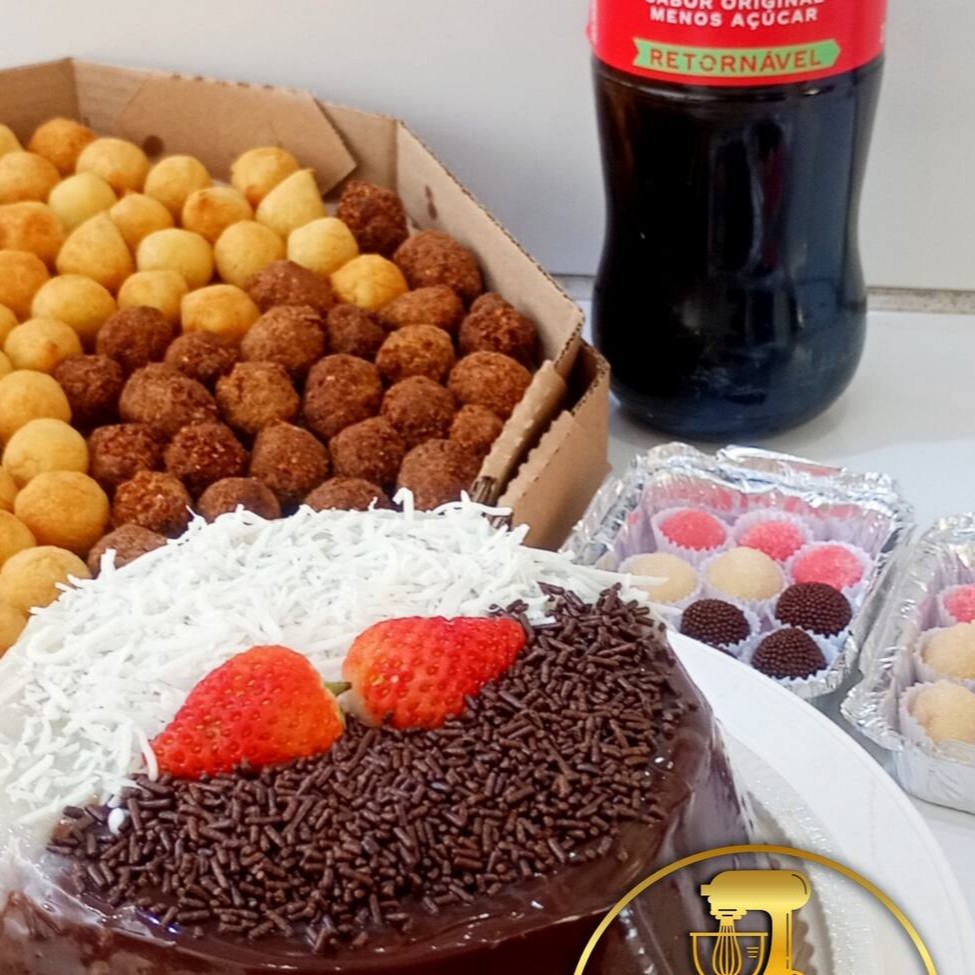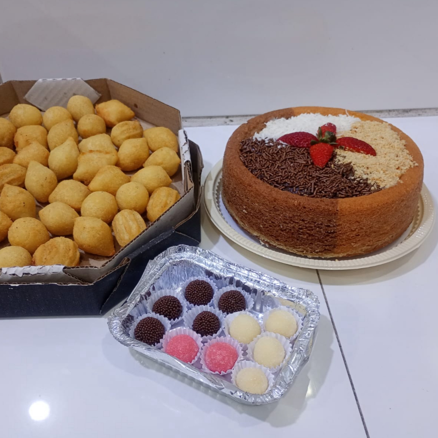 Delicia de bolo massa leve , macia com cobertura tradicional . O kit acompanha 30 Salgadinhos deliciosos , fritos na hora e 10 docinhos sabores sortidos e irresistível. Uma ótima opção para uma simples comemoração ou um lanche bem gostoso .