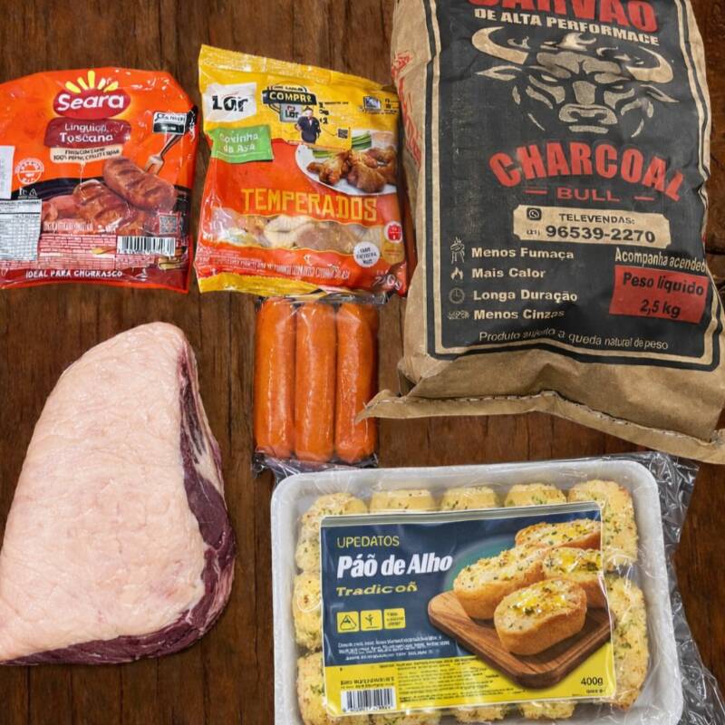 1kg de picanha 700gr de coxinha da asa 600gr linguiça Salsichão Pão de alho Carvão de 2,5kg. Kit serve de 5 a 6 pessoas.