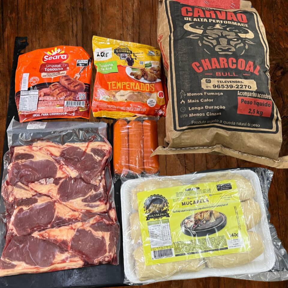 1kg de contra filé 700gr de coxinha da asa 600gr linguiça Salsichão Pão de alho Carvão de 2,5kg. kit serve de 5 a 6 pessoas!