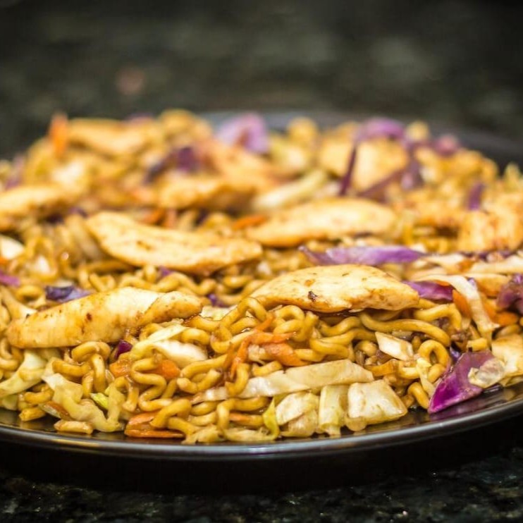 Delicioso yakisoba de frango. Ingredientes: Macarrão de yakisoba premium, repolho roxo, repolho verde, cenoura, frango.
