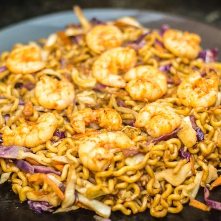 Delicioso yakisoba de camarão. Ingredientes: Macarrão de yakisoba premium, repolho roxo, repolho verde, cenoura, camarão.