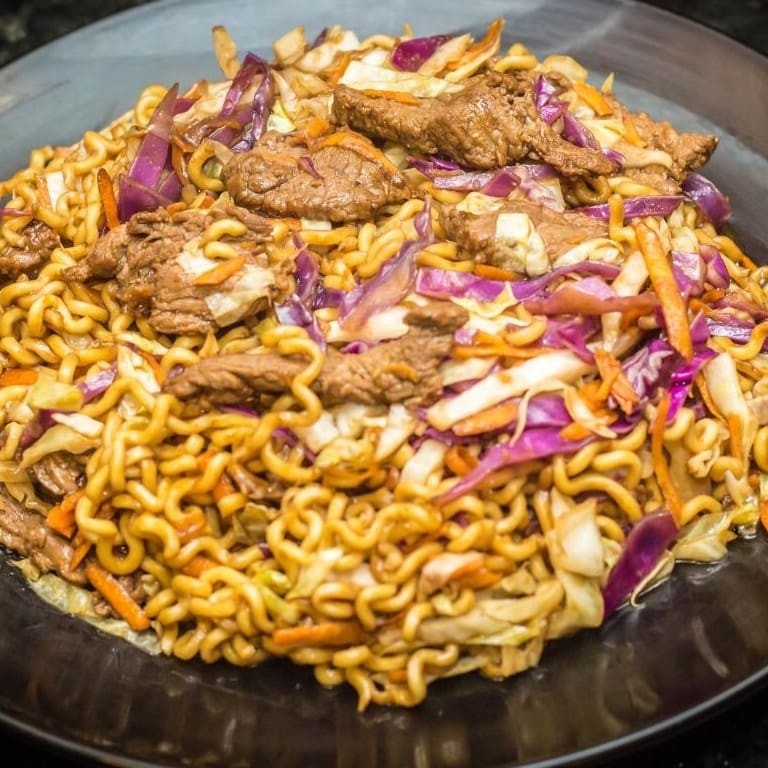 Delicioso yakisoba de carne. Ingredientes: Macarrão de yakisoba premium, repolho roxo, repolho verde, cenoura, carne.