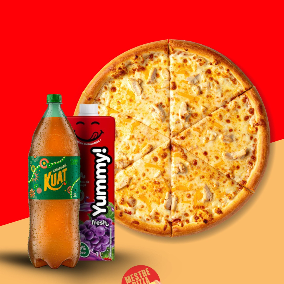 Uma pizza família de 40 cm, com borda dourada e generosa cobertura, perfeita para compartilhar! Acompanha um refrigerante gelado de 2 litros para completar a experiência. Ideal para reunir a galera e saborear cada fatia com muito prazer. Sabor, tamanho e refrescância em uma só oferta!
