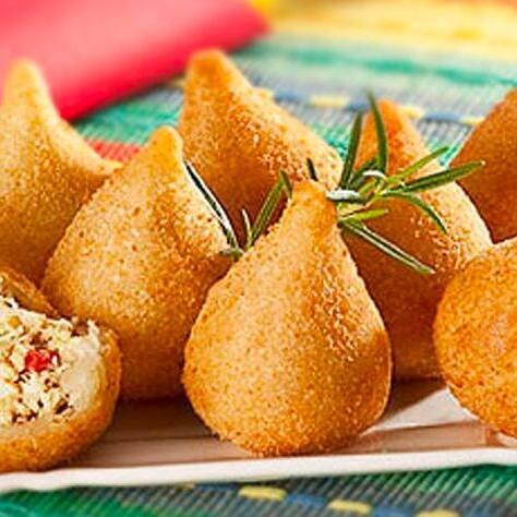 Coxinha de frango saborosa, sequinha e de qualidade, fritas em óleo de algodão, unidade.