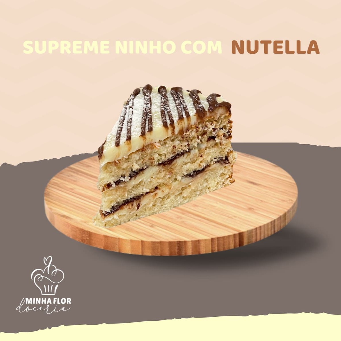 Massa branca fofinha, recheada com nosso creme de Ninho super cremoso e camadas generosas de Nutella. Um clássico que cresceu com a gente e continua conquistando corações a cada fatia feito com ingredientes de qualidade e o cuidado artesanal que é a essência da Minha Flor. Delicado, marcante e simplesmente irresistível.