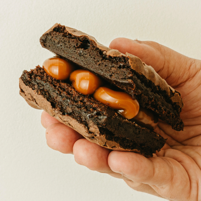 Brownie macio por dentro, com casquinha crocante e recheio generoso de doce de leite. A cremosidade do recheio encontra a textura molhadinha da nossa receita exclusiva, criando uma explosão de sabor a cada mordida. Irresistível do primeiro ao último pedaço.