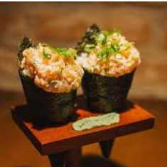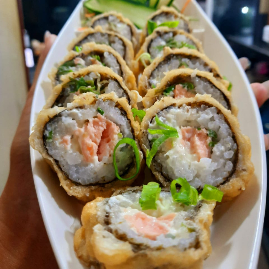 arroz empanado, salmão cream cheese, pepino japones, tempero oriental