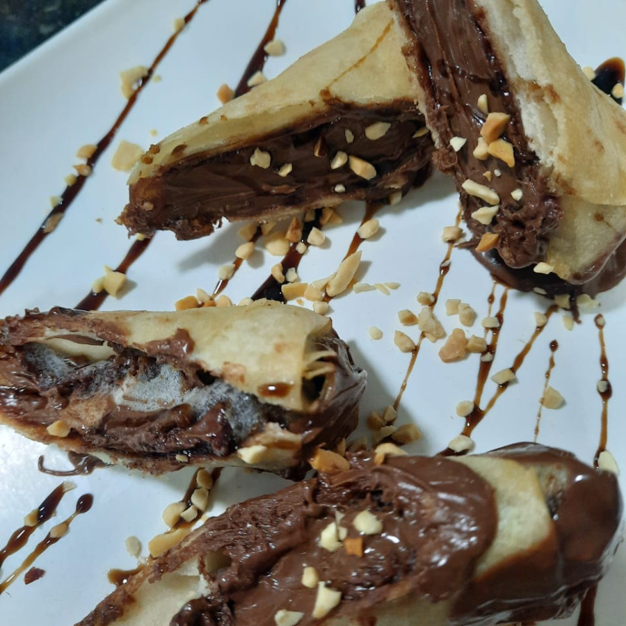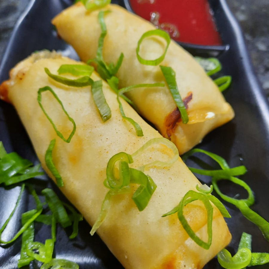 Temaki feito na massa do harumaki, arroz, salmão , cream cheese, cebolinha, frito