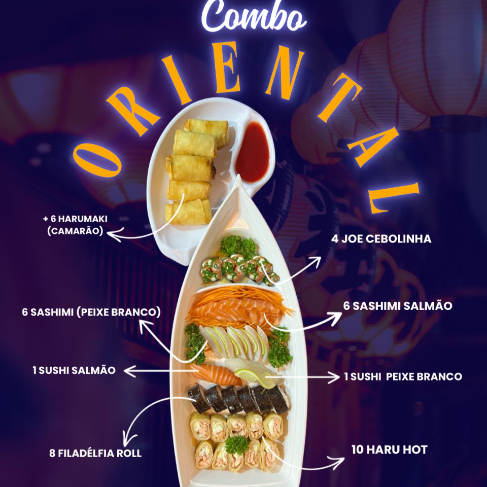 6 sashimi salmão, 6 sashimi peixe branco, 8 hossomaki filadélfia roll, 10 haru hot, 6 harumakis camarão, 2 harumakis chocolate