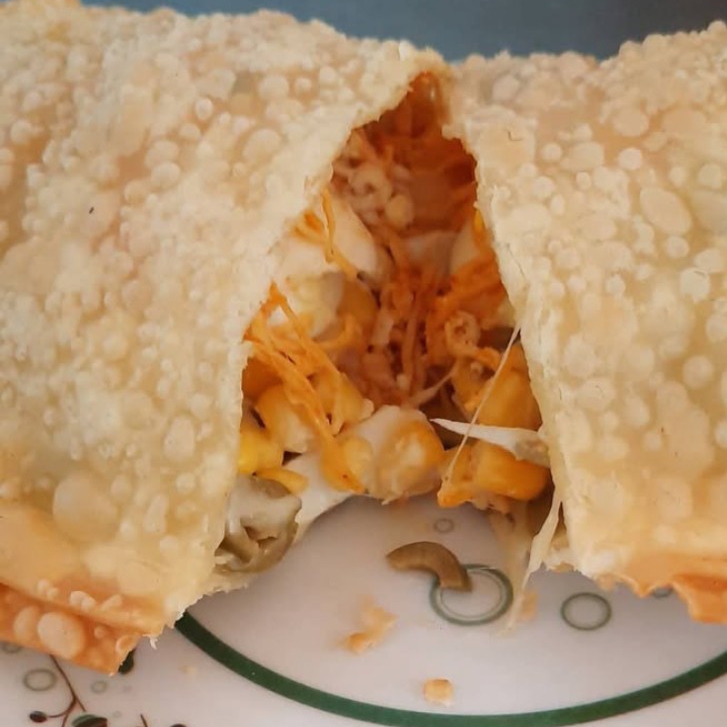 Um pastel recheado com frango desfiado e milho,com 20 cm perfeito para um lanche rápido.