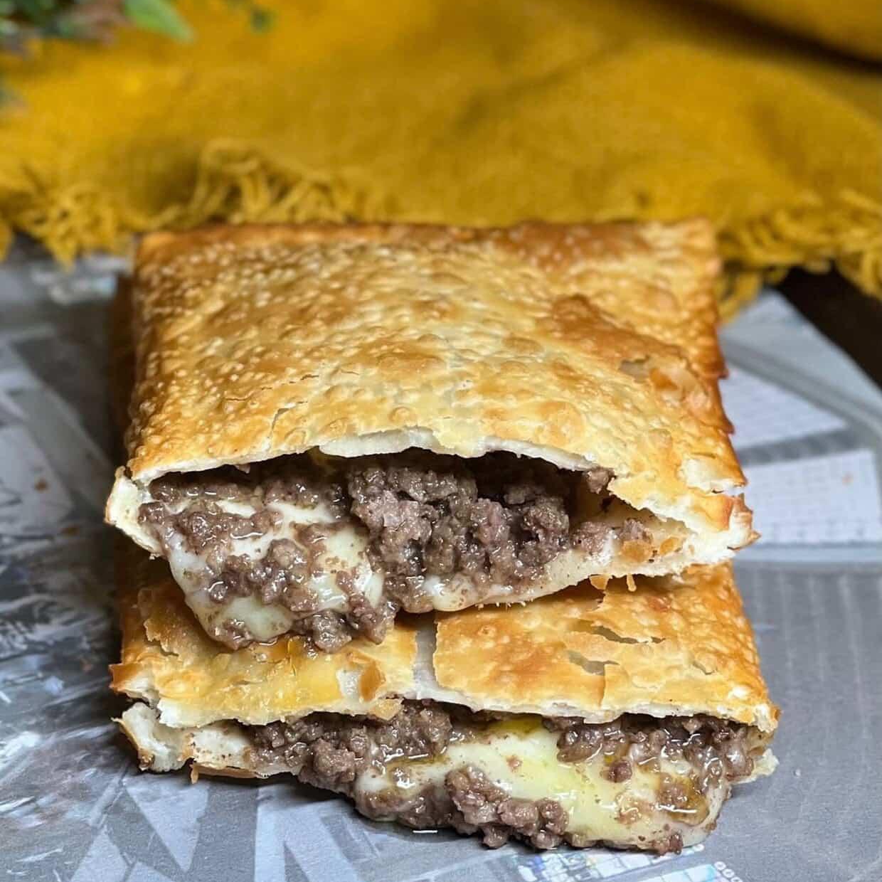 Pastel irresistível com recheio de carne moída e queijo derretido, com 20cm ,perfeito para qualquer ocasião.