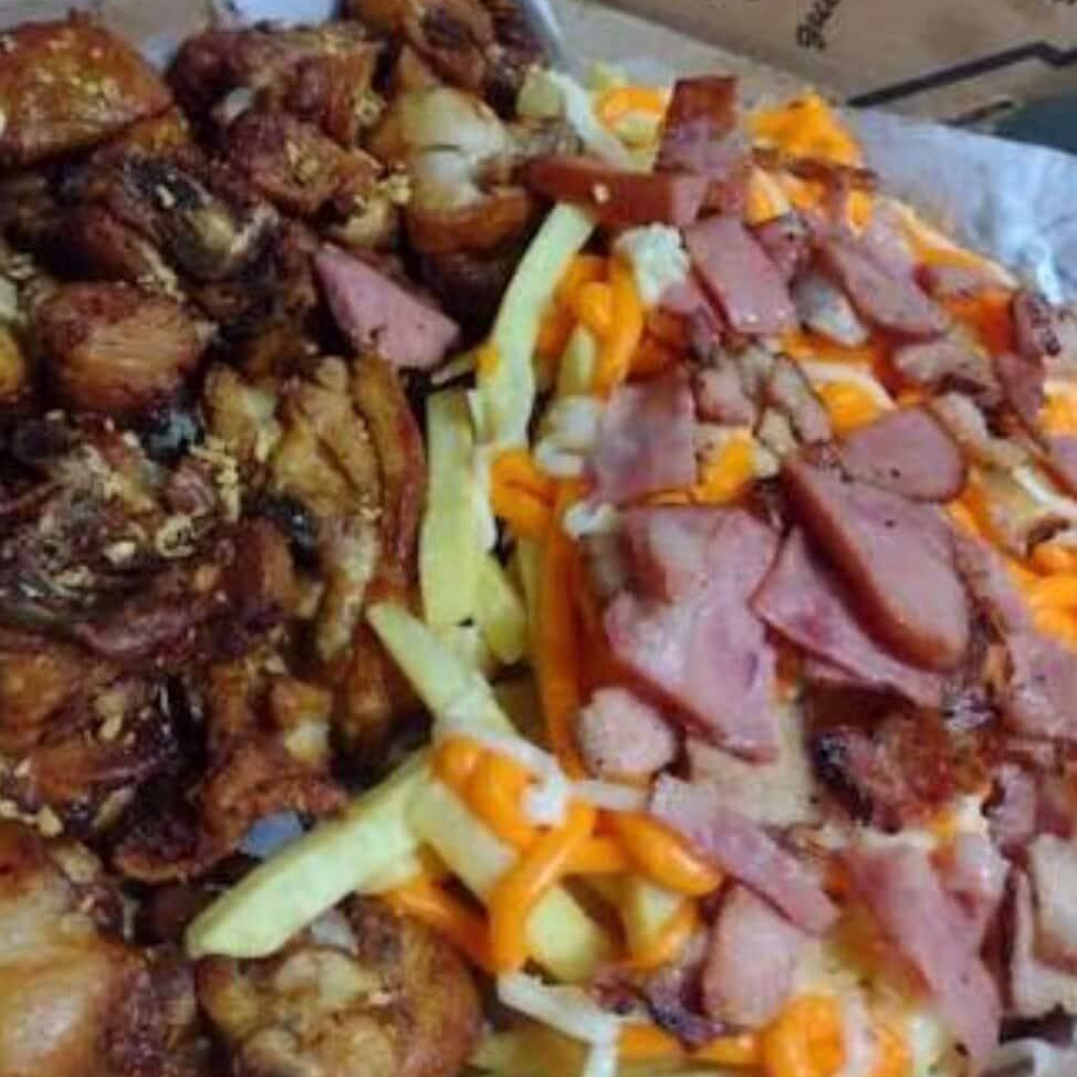 Batata frita com frango suculento,bem fritinho e temperado acompanhado de calabresa,bacon e molho cheddar .