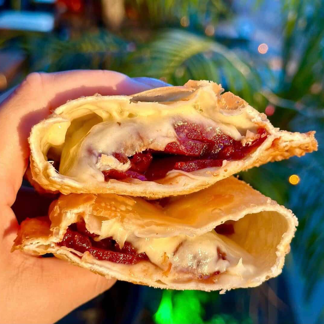 Pastel frito recheado com goiabada e queijo formando aquela combinação perfeita