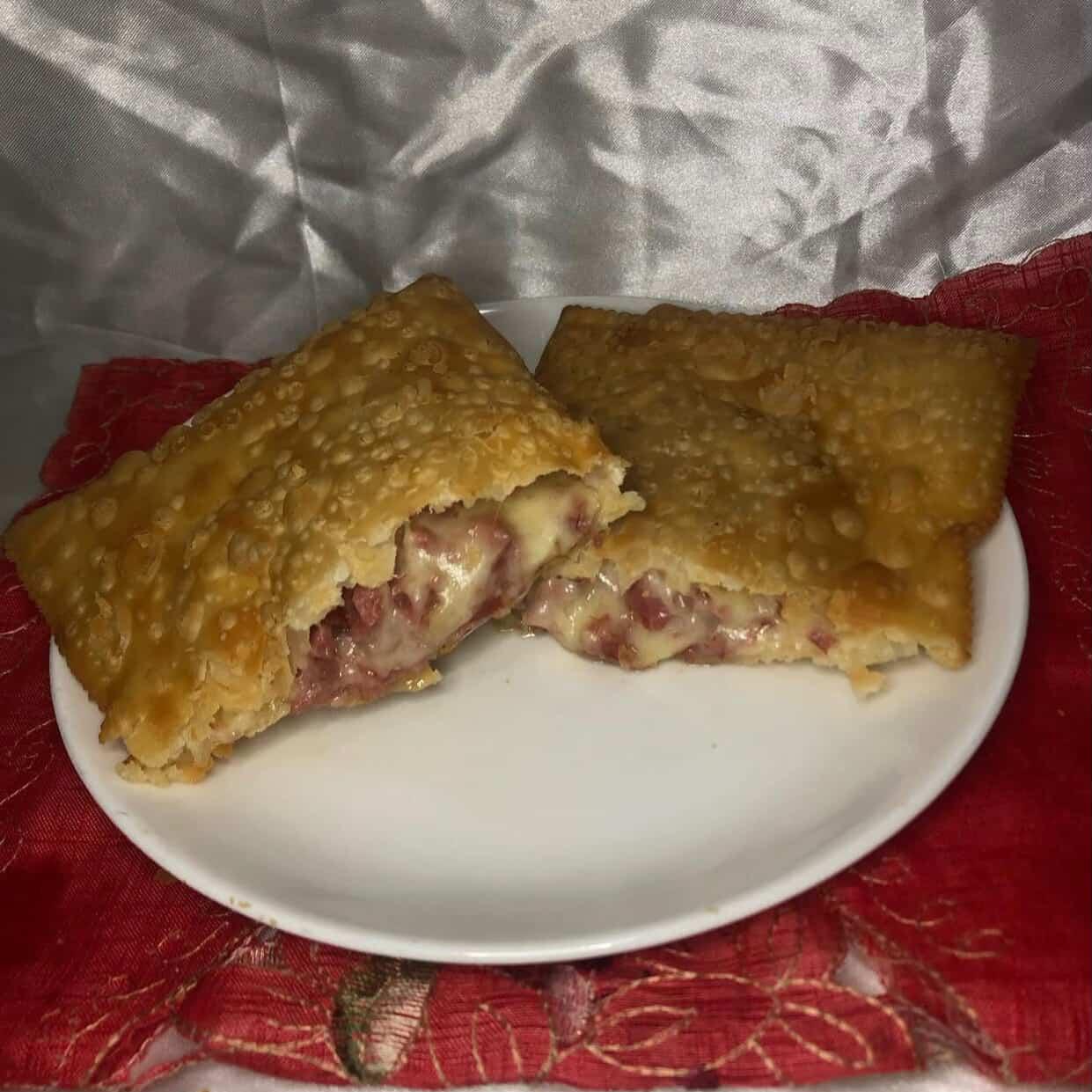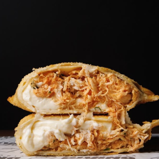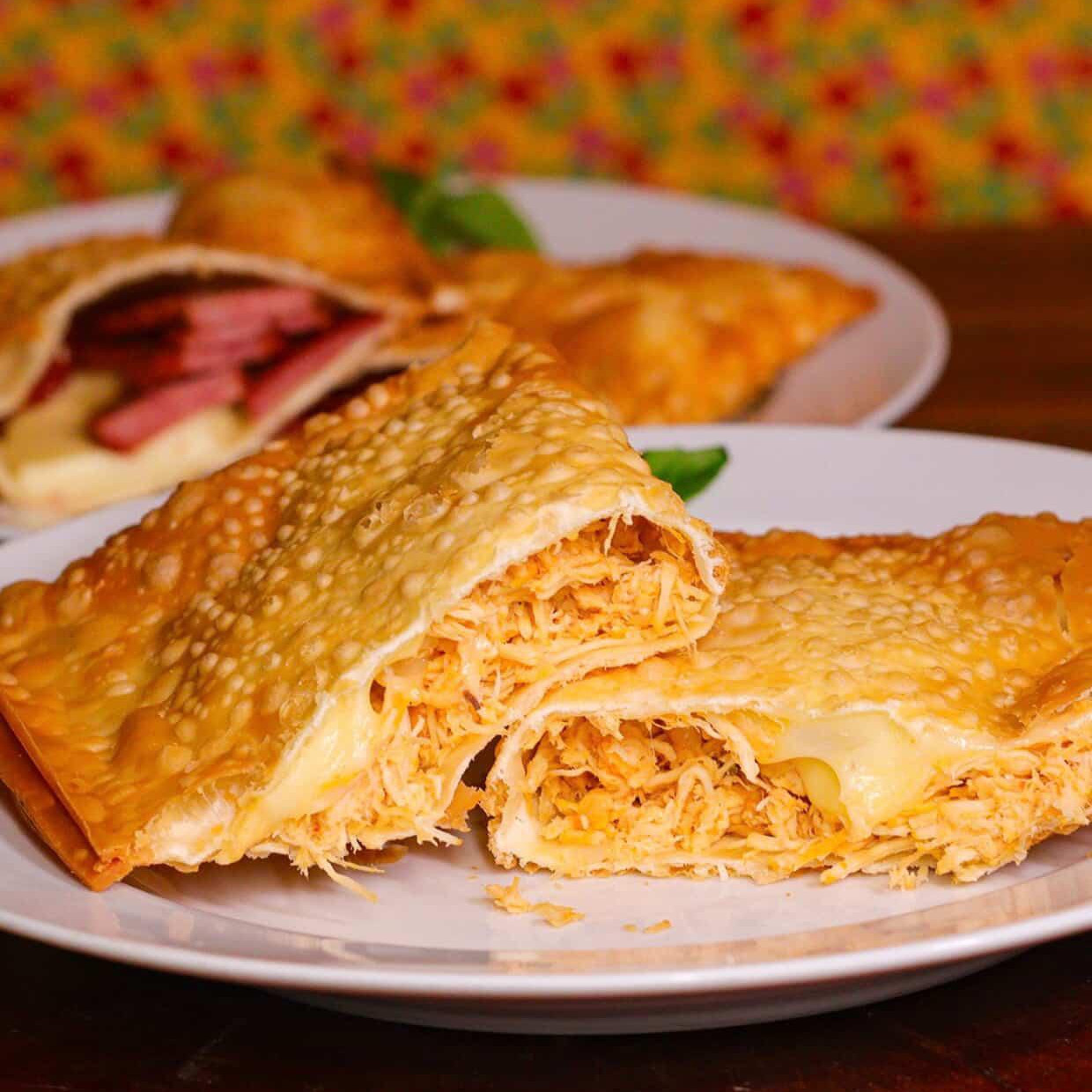 Recheio de queijo, presunto e orégano em um pastel crocante. Um clássico reinventado.