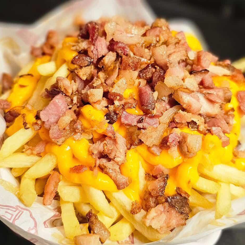 Uma deliciosa porção de batata frita com calabresa, bacon e molho cheddar