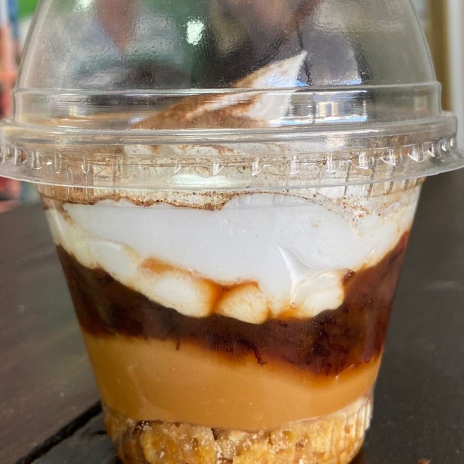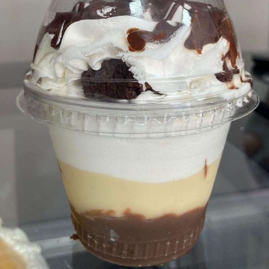 Doce de leite, mousse de banana e chantilly com canela. Serve 1 pessoa.