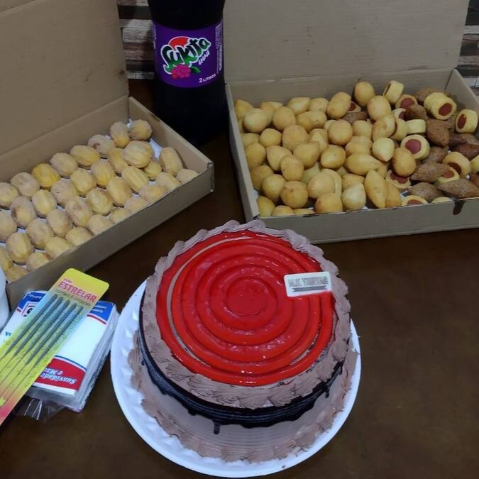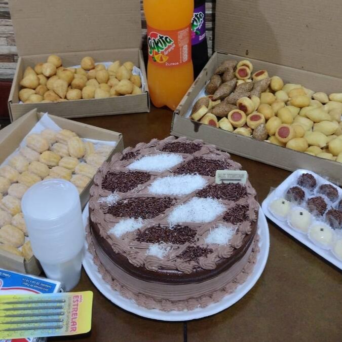 1 Torta Média 200 Salgadinhos 60 Mini Churros 30 Docinhos 3 Refrigerantes Copos & Guardanapos Vela (Brinde).