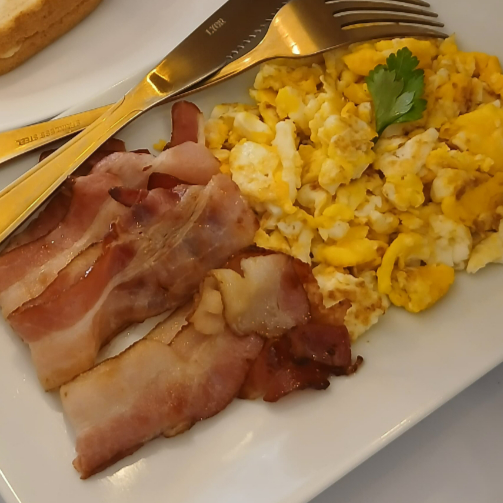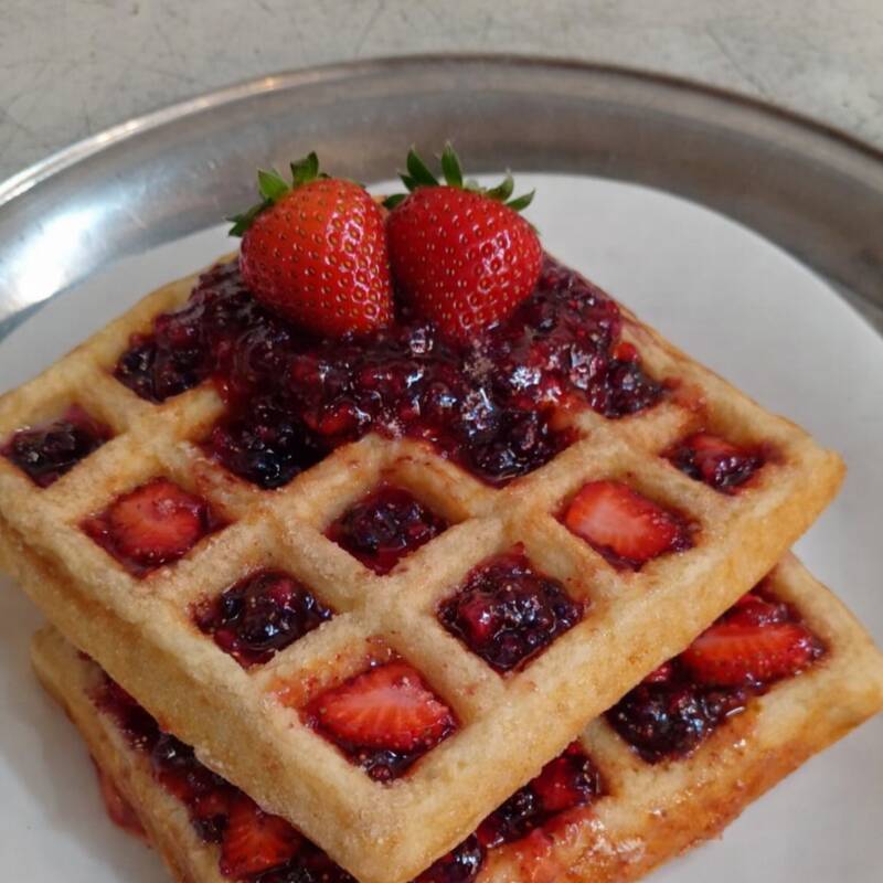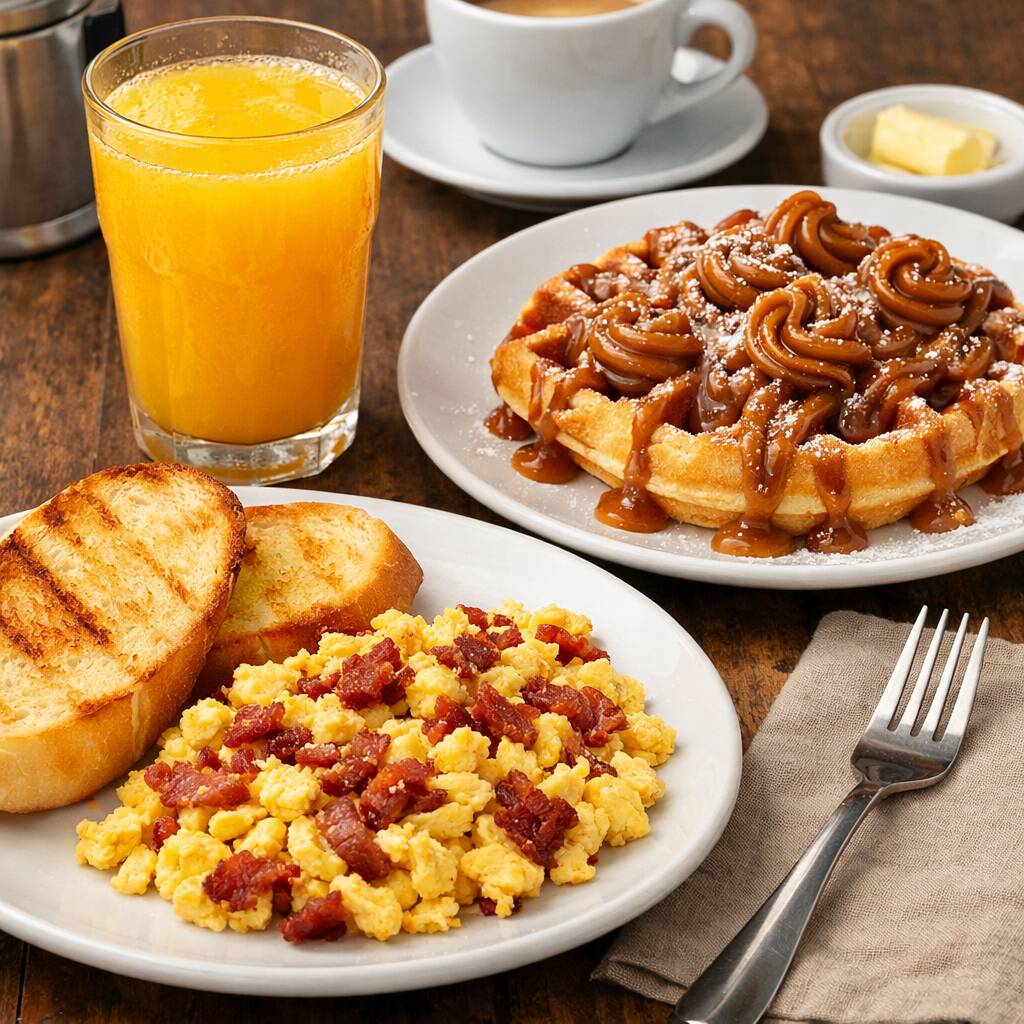 Ovos Mexidos com Bacon, Pão na chapa, suco de laranja (300ml) e uma Sobremesa de Waffle com Doce de Leite.