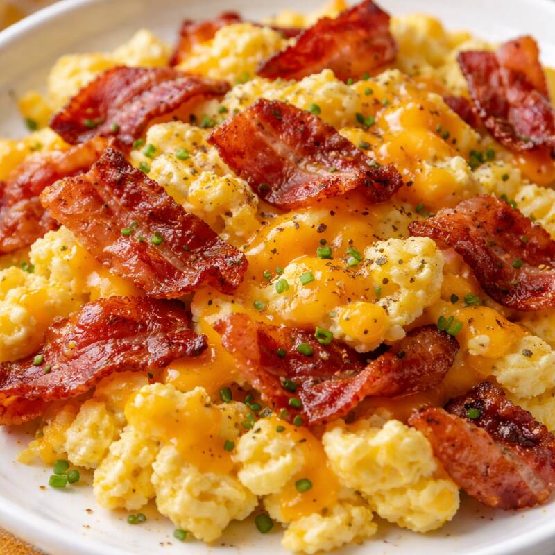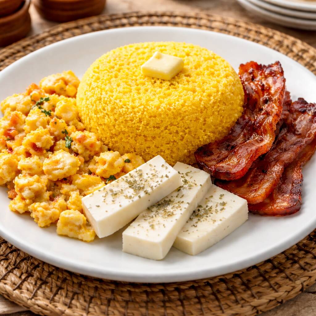 Cuscuz com Ovos Mexidos, Bacon e Queijo Minas.