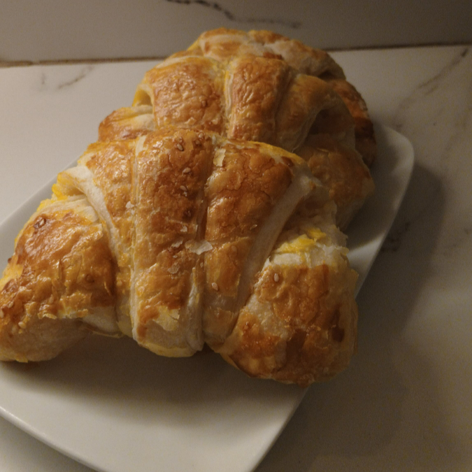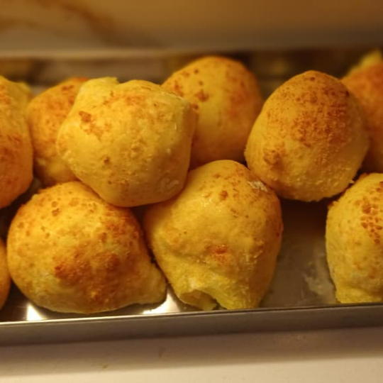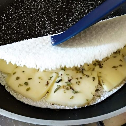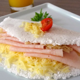 Massa de tapioca com ovo, recheada com prersunto e muçarela.