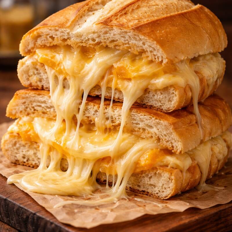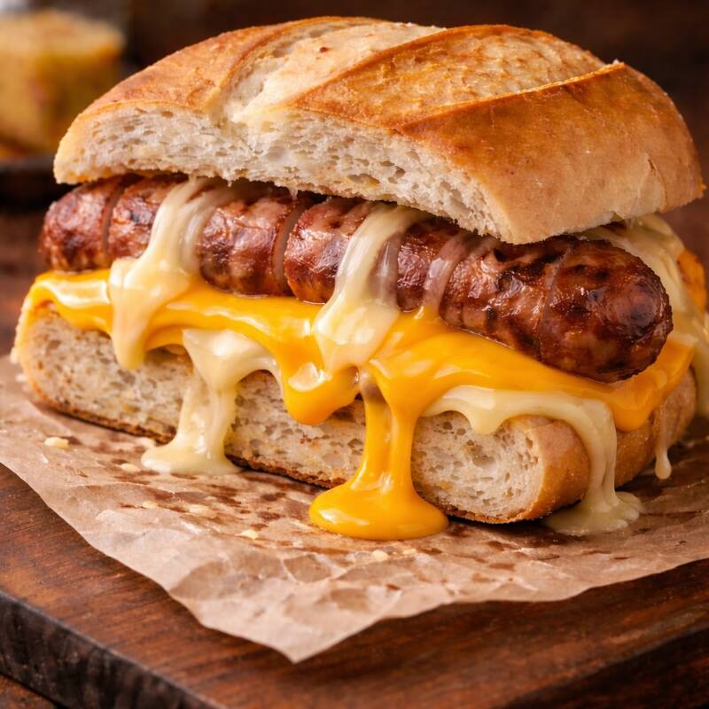 Pão francês, linguiça mineira, muçarela, queijo prato e cheddar.