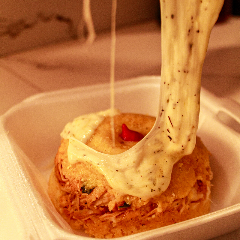 Cuscuz com Peito de Frango Desfiado, Requeijão e Muçarela.