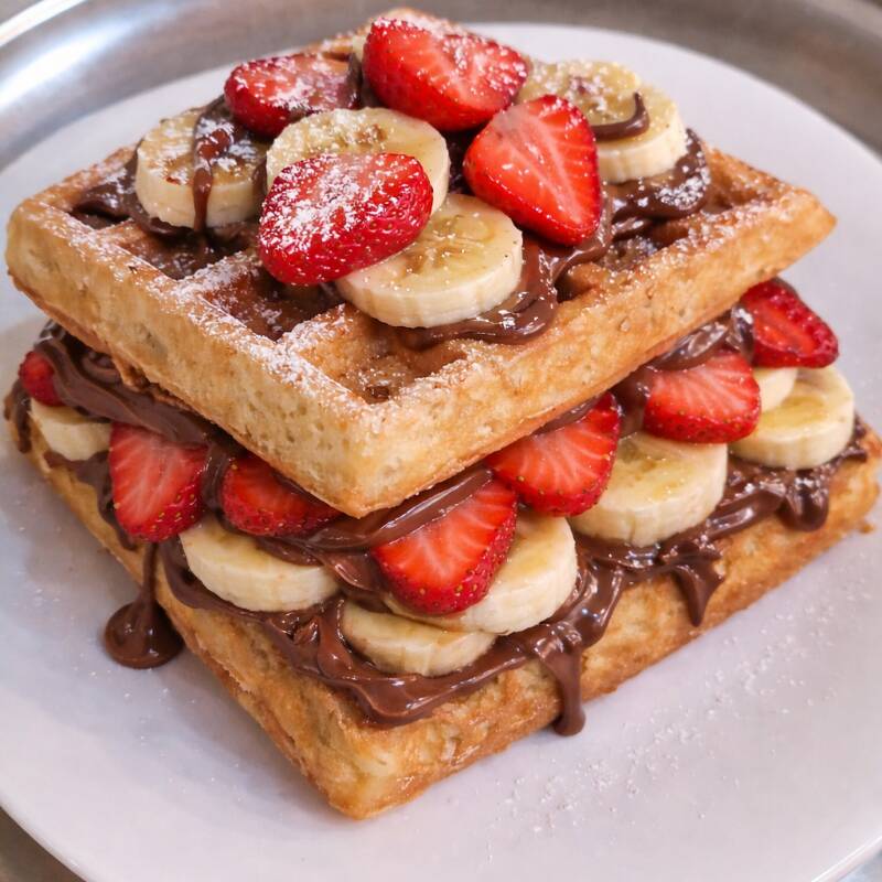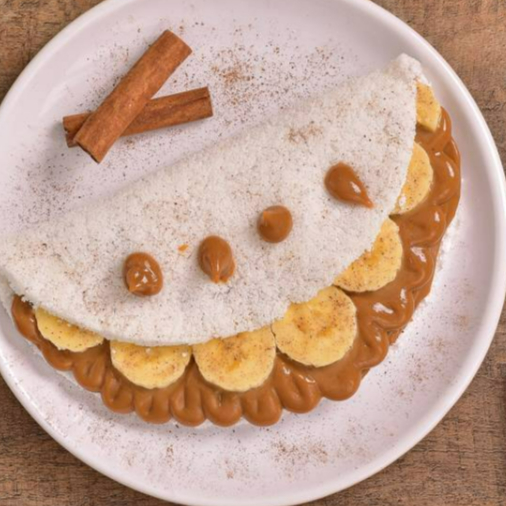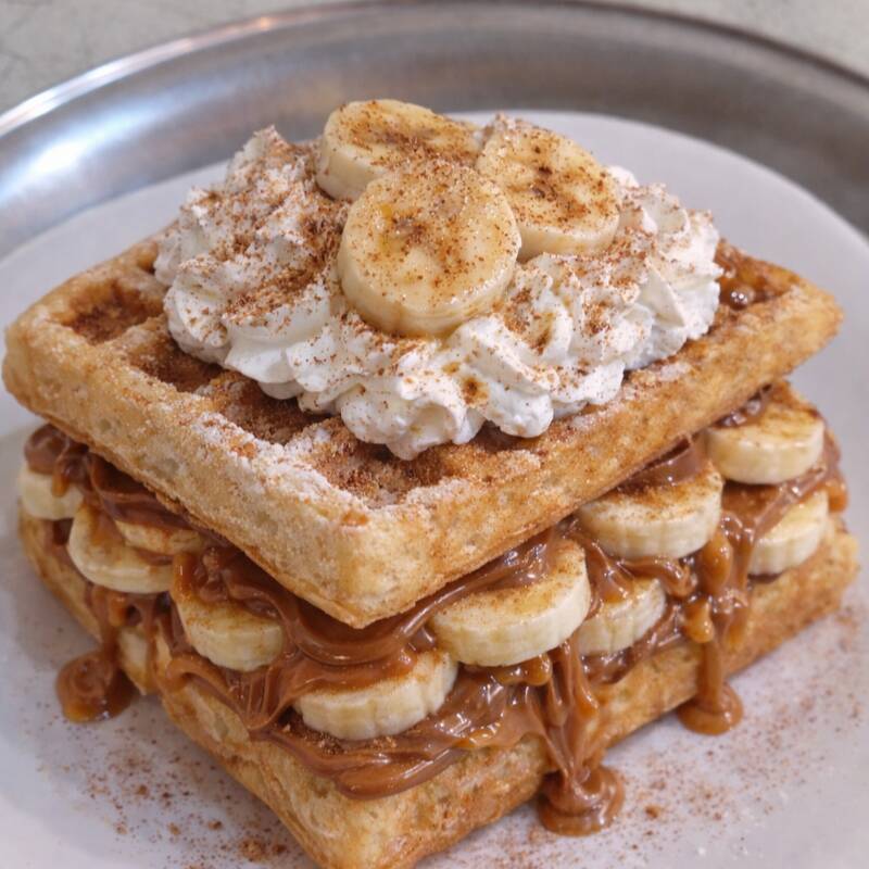 Waffle doce, banana, doce de leite, chantilly e canela.