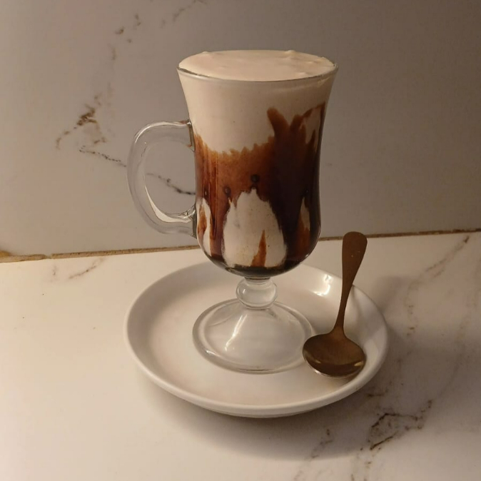 Cappuccino gelado, café expresso, calda de caramelo salgado e chantilly.