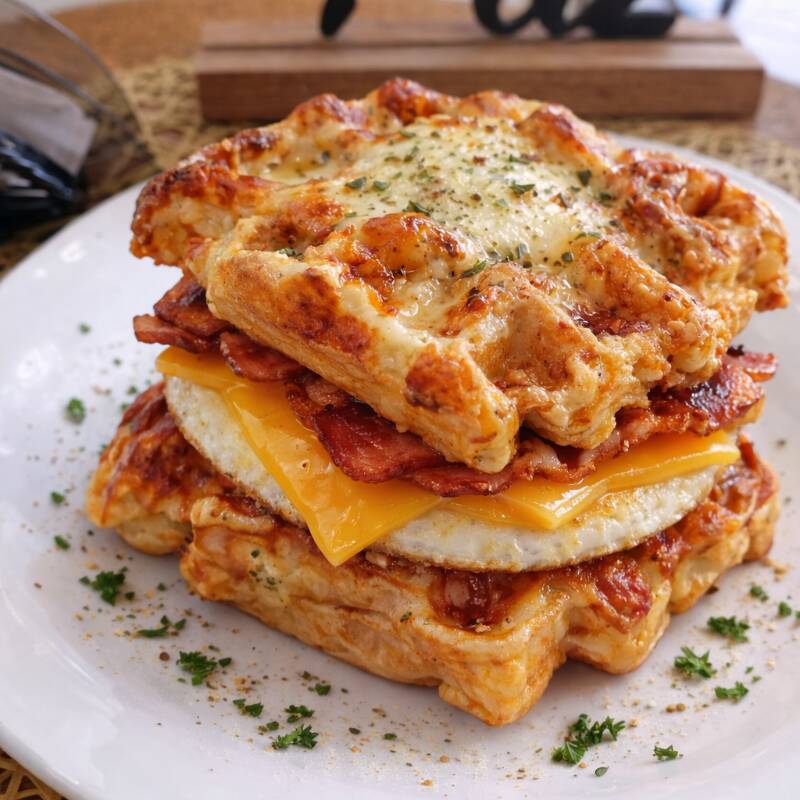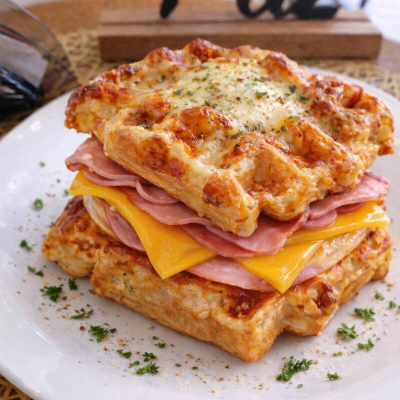 Waffle de pão de queijo, ovo, presunto, quiejo parto e bacon