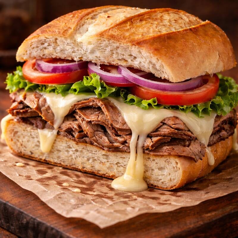 Pão, Carne Assada, Queijo prato, Baconese, Alface, Tomate e Cebola roxa.