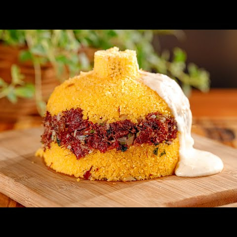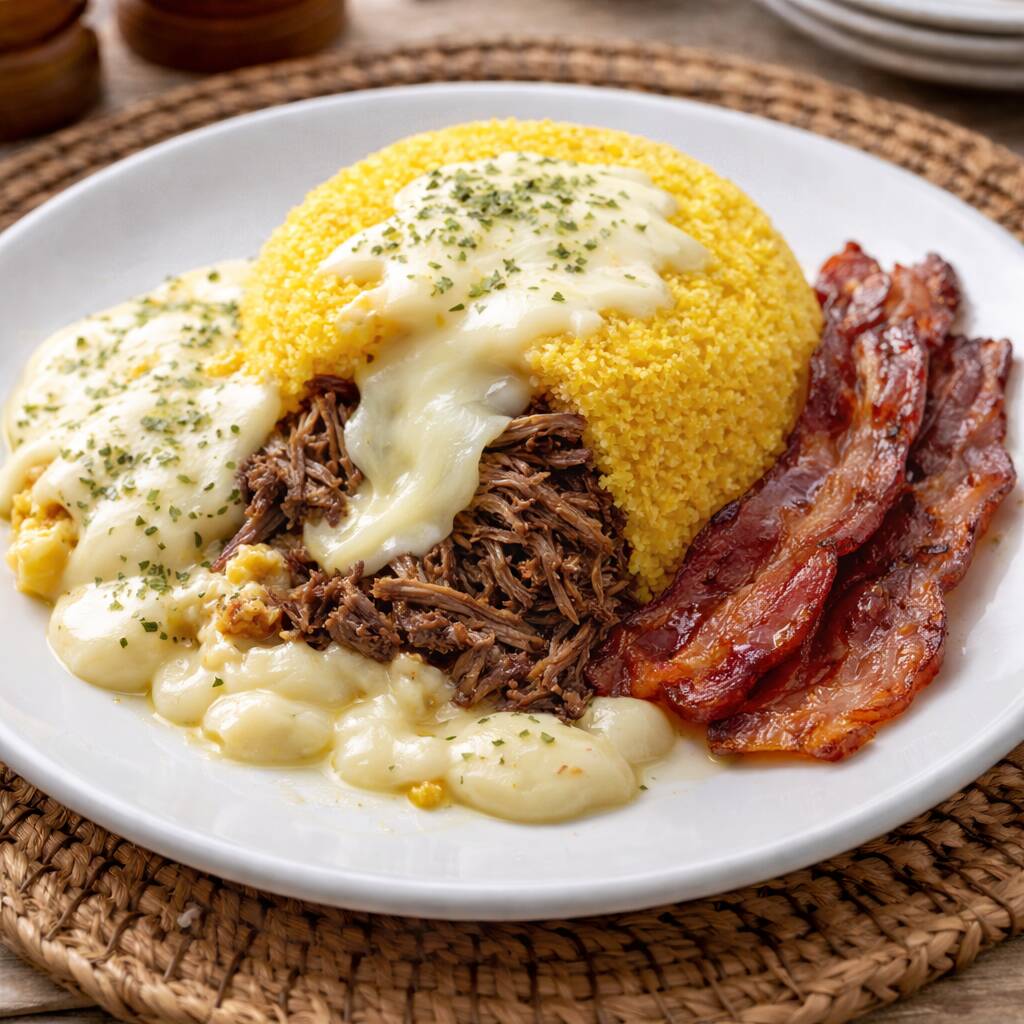 Cuscuz com Carne Assada Desfiada, Bacon, Requeijão e Muçarela.