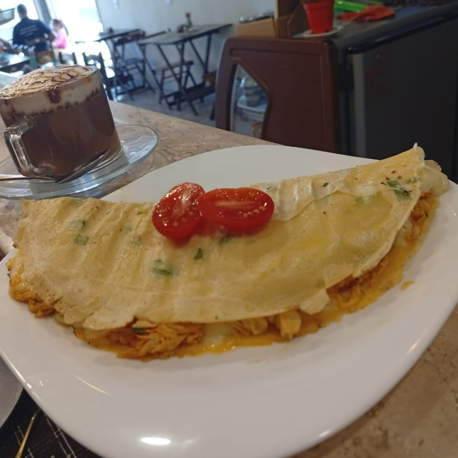 Massa de tapioca com ovo, recheio de frango com requeijão e muçarela.