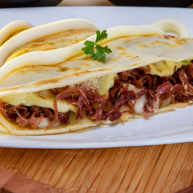 Massa de tapioca com ovo, recheado com carne seca e queijo minas.
